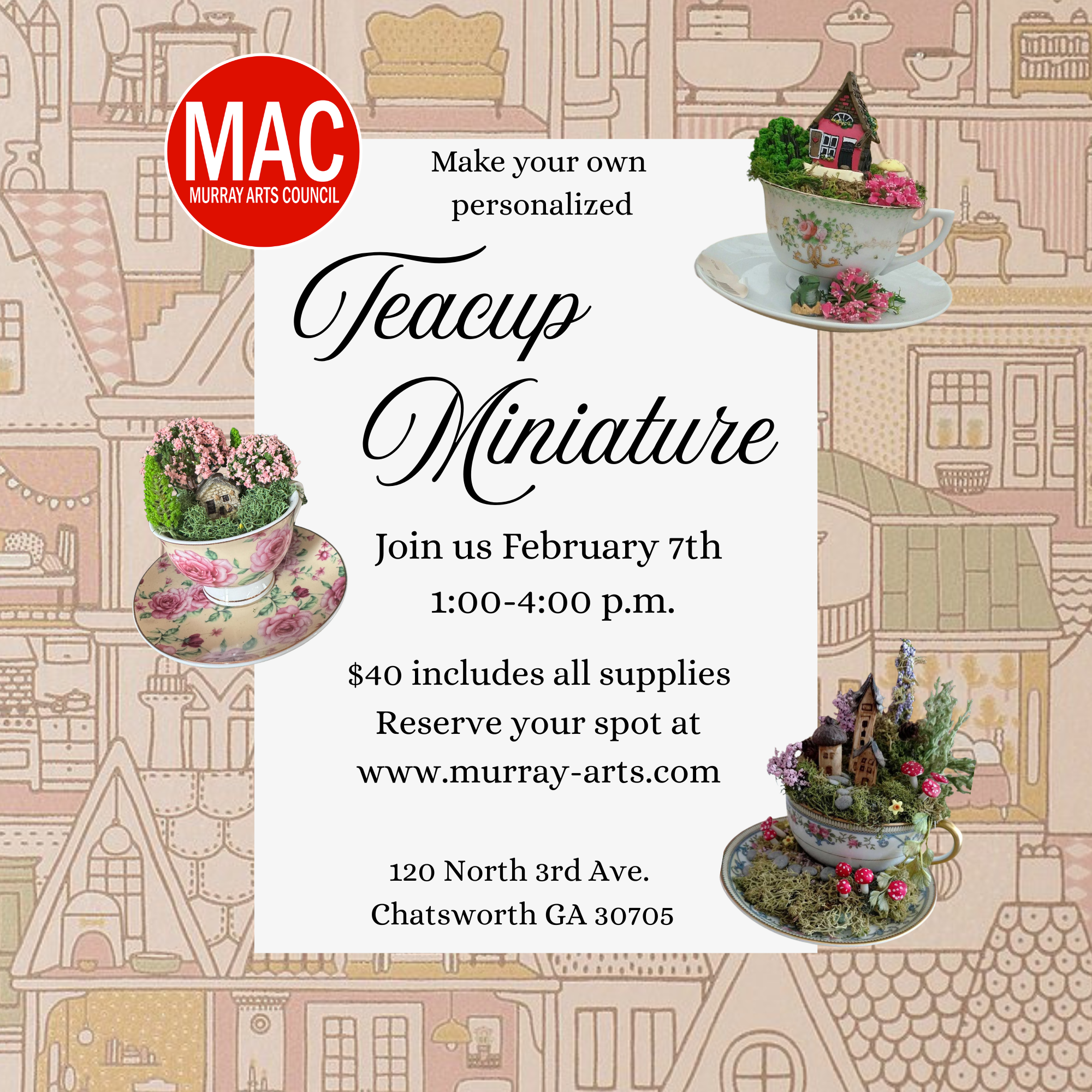 Join local miniaturists Sara Bethea and Suellen Hoecker on February 7th, from 1-4pm for this class where you will learn to make your own miniature in a teacup. Materials for the class are included in the $40 class fee. Class participants are encouraged to display their creations during MAC’s annual Miniature Masterpieces Exhibit in March. Class size is limited. Must be age 15 or older to sign up. Register by January 24th, 2026. If you have any questions, please email us at murrayartscouncil@gmail.com, with “Miniature Class” in the subject line.